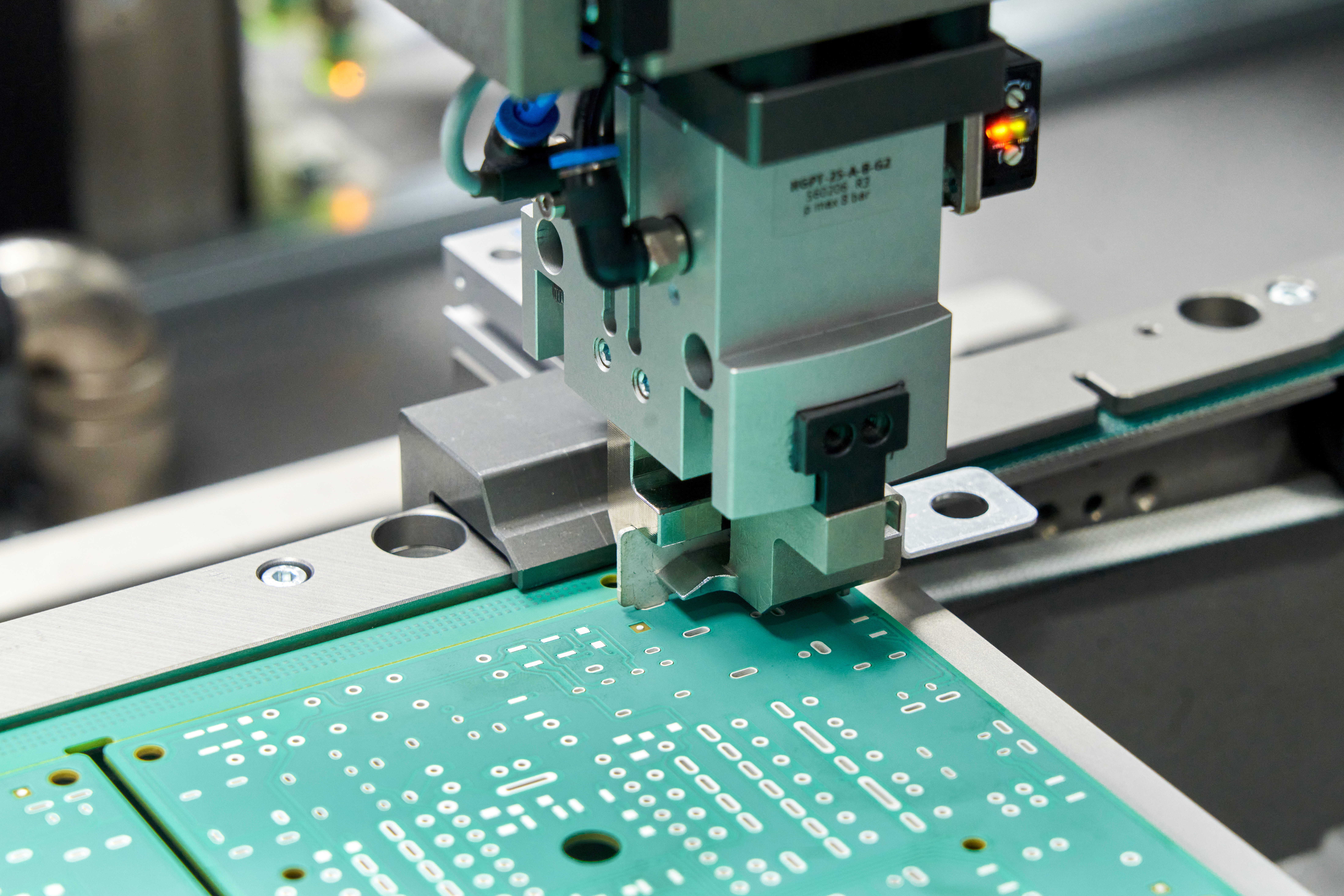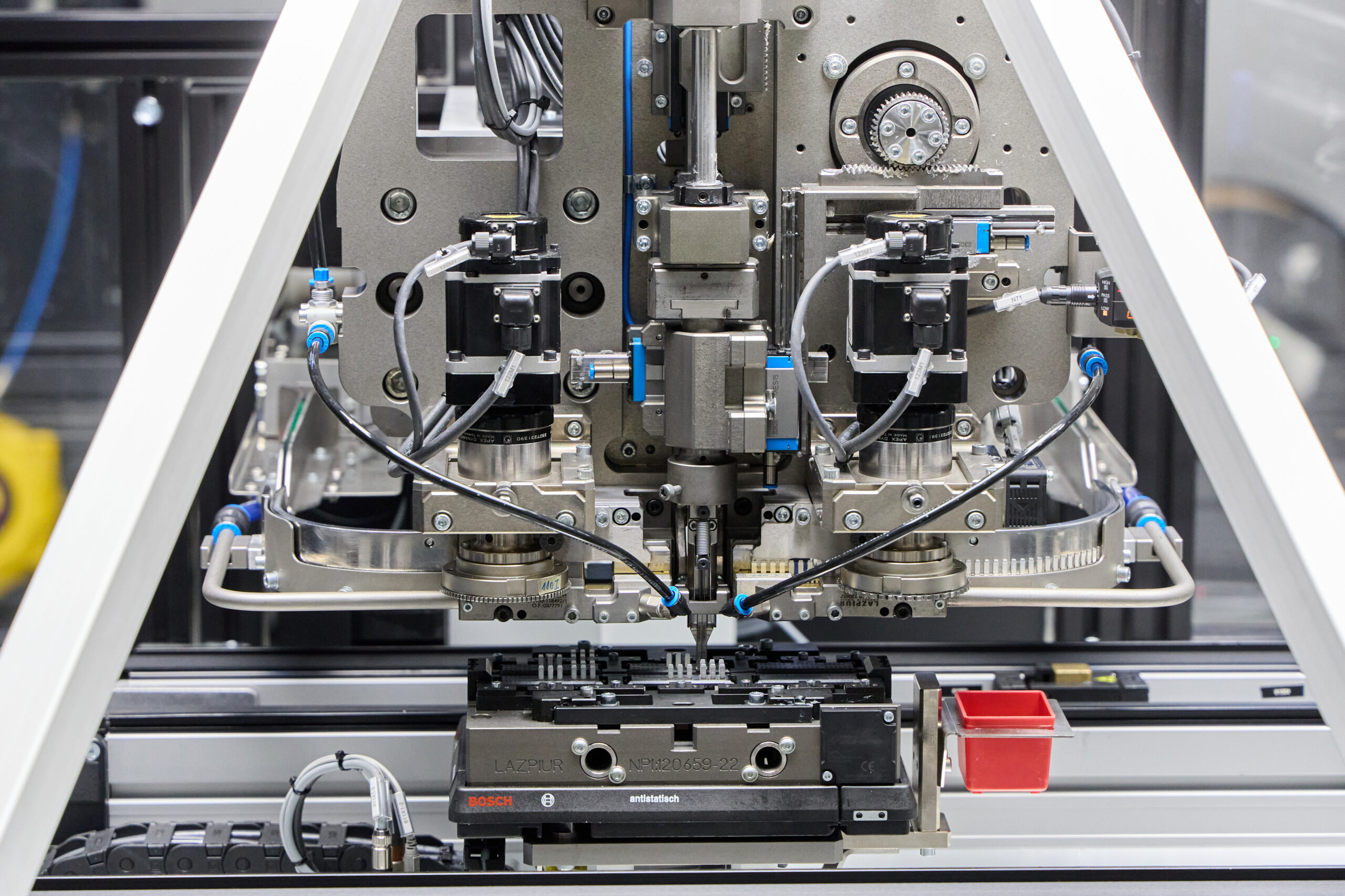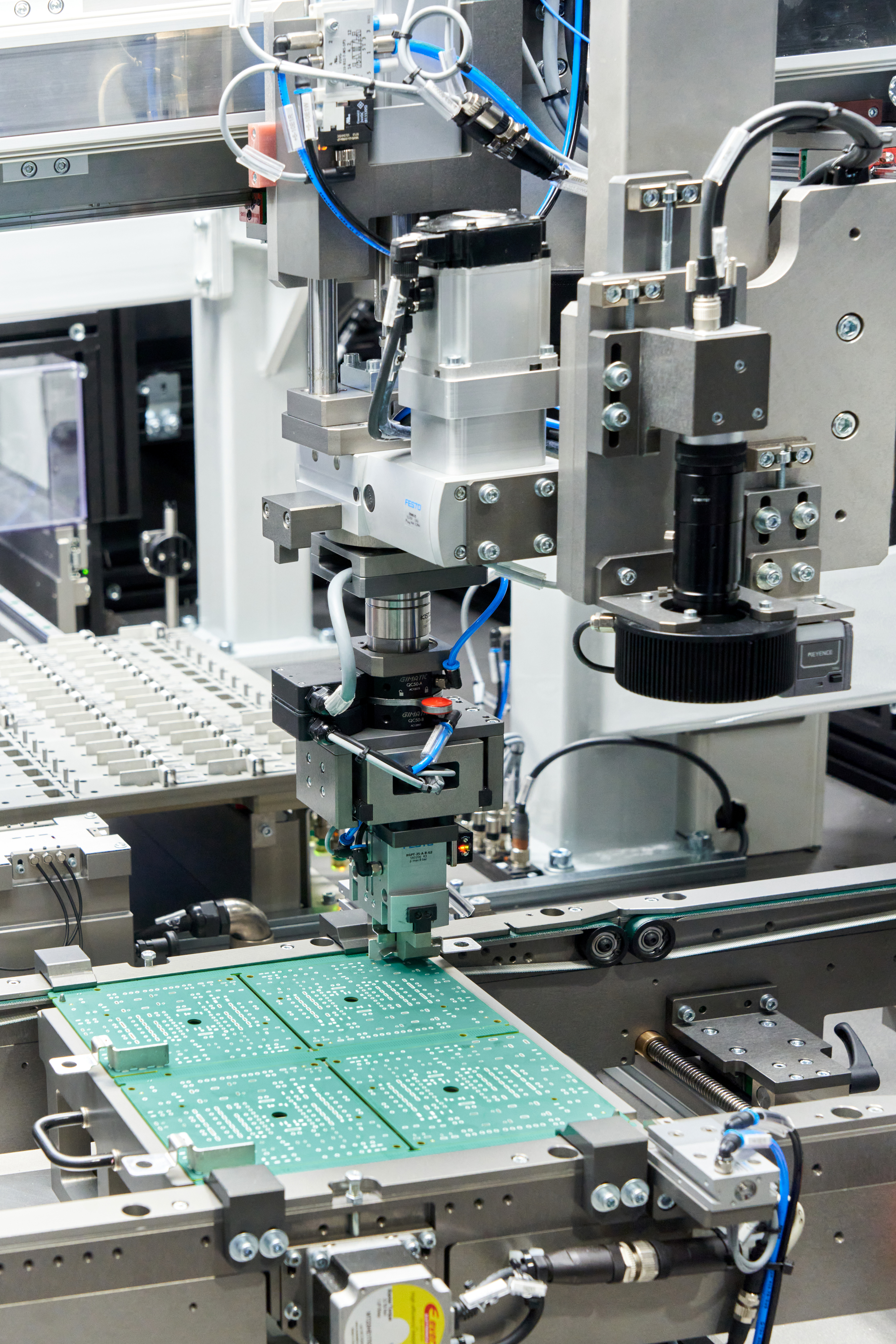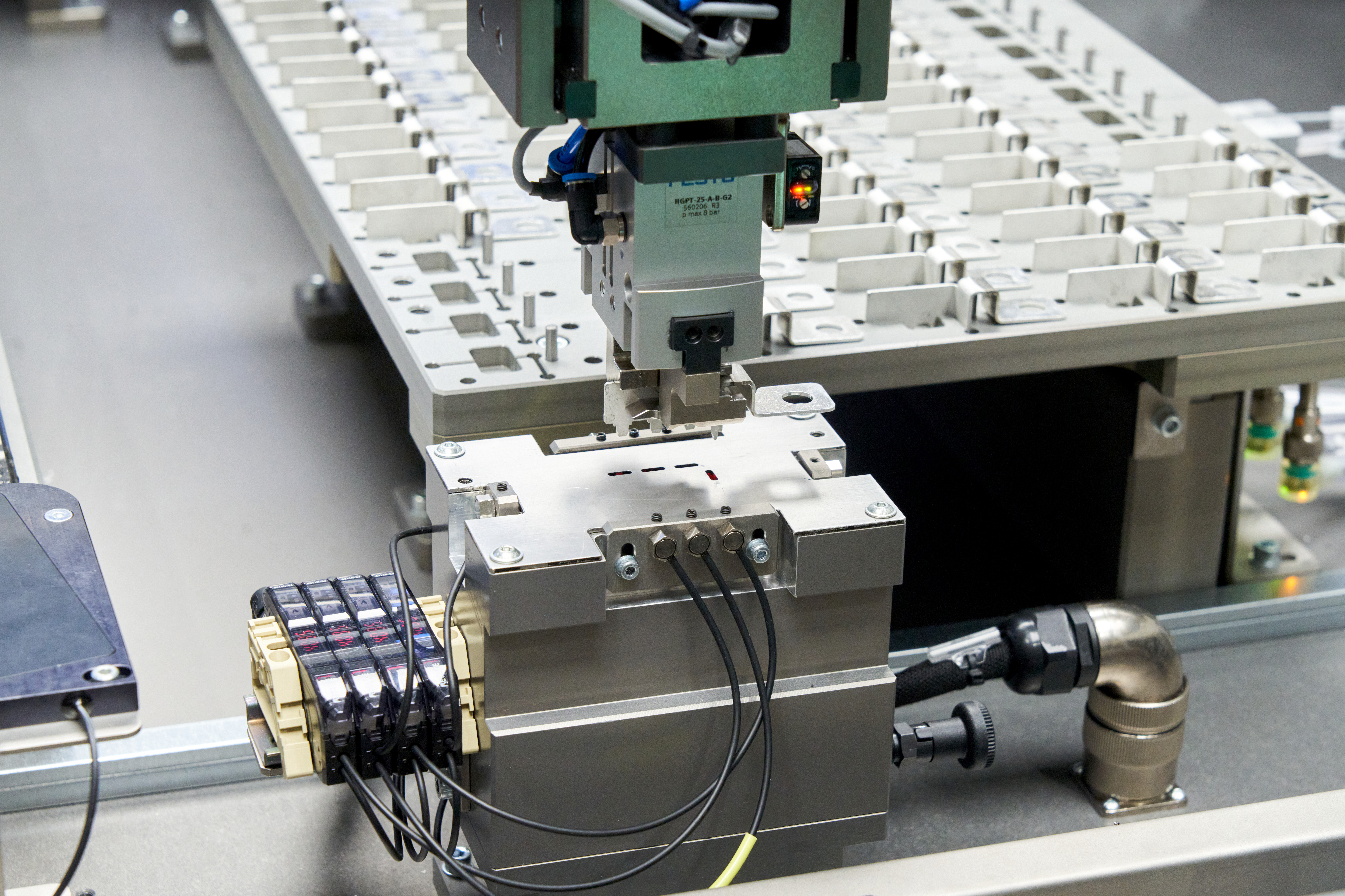 Máquina de montaje de busbar sobre PCB, diseñada bajo filosofía de cambio rápido que permite adaptarse eficientemente a diferentes referencias y configuraciones de producto.