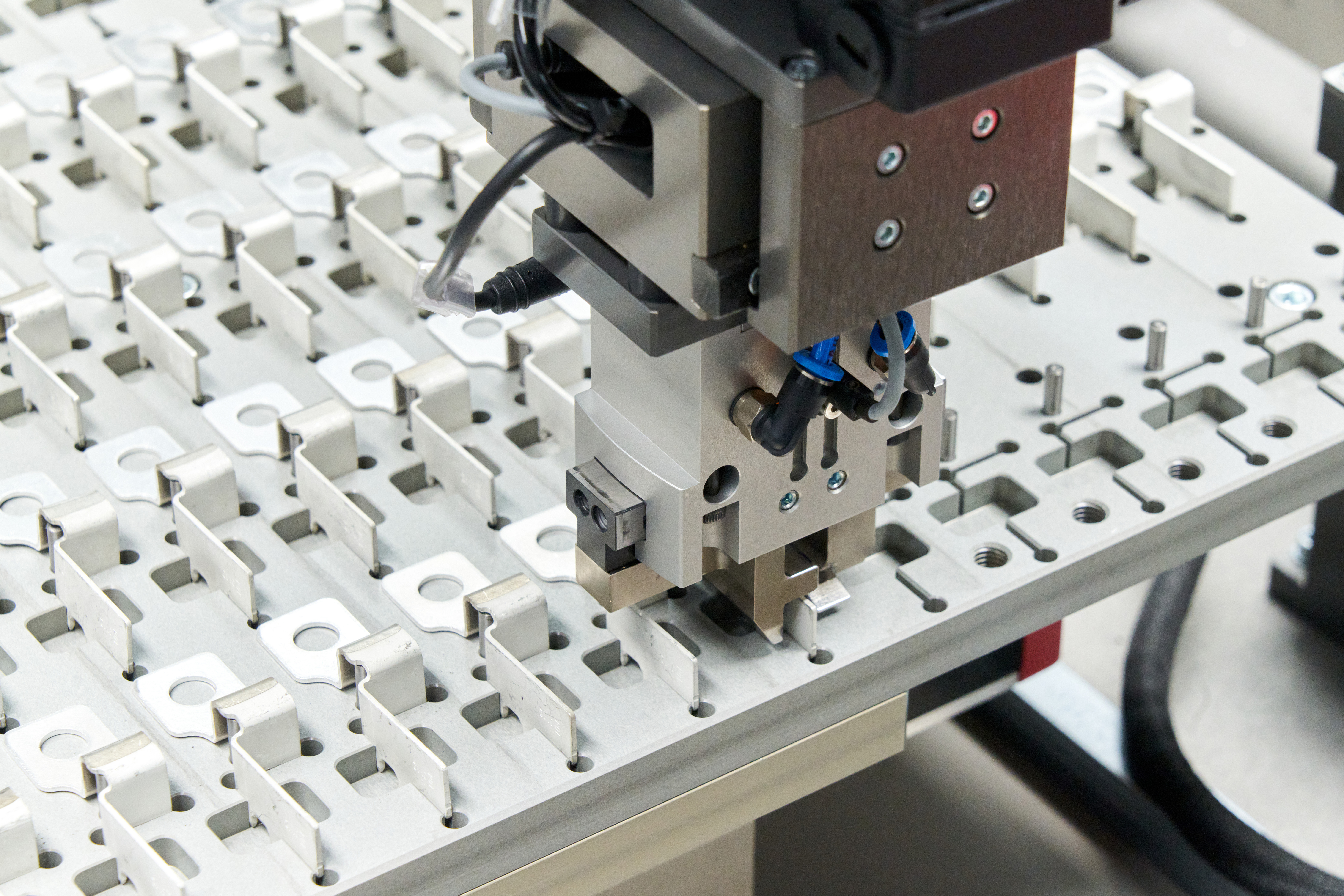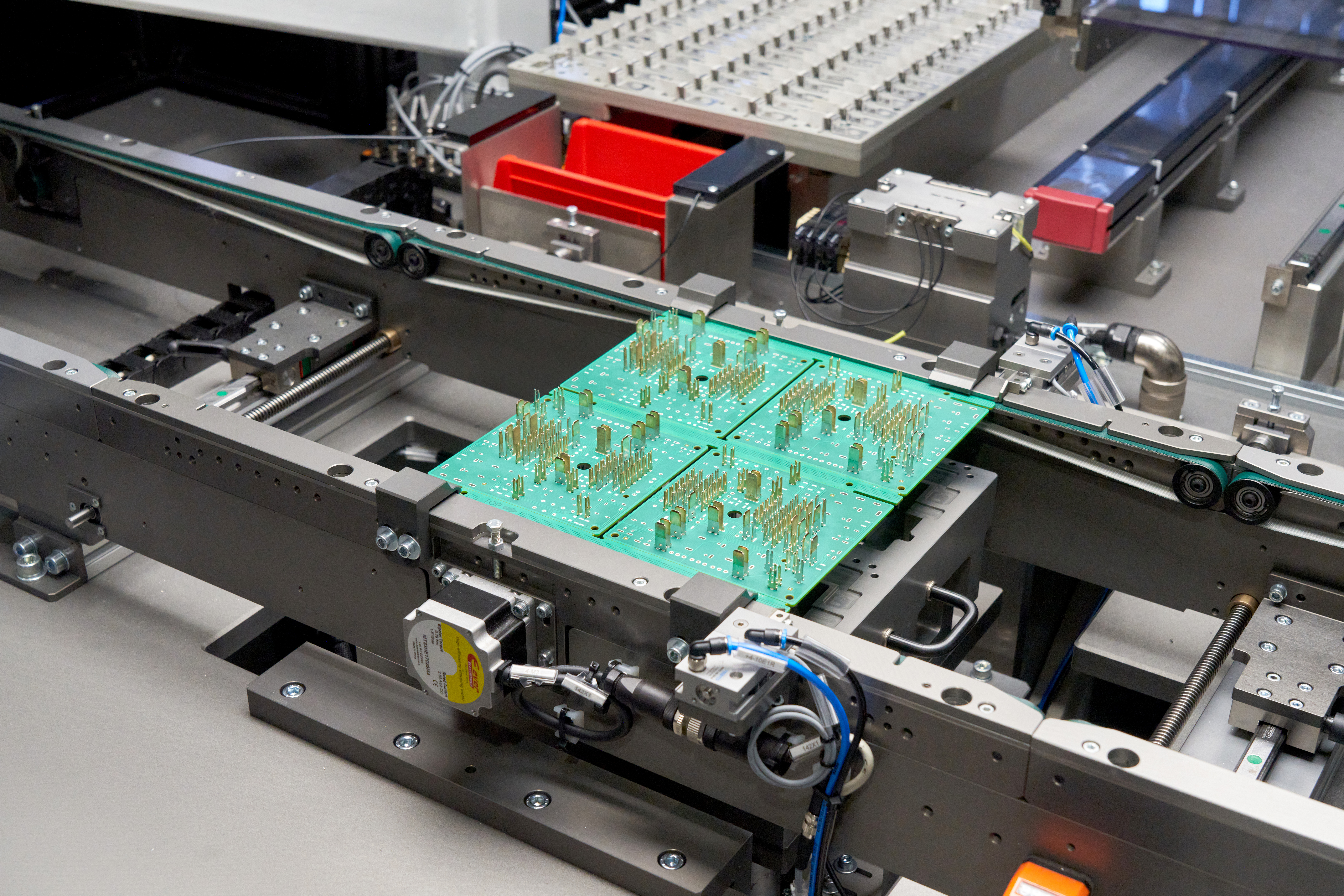 Máquina de montaje de busbar sobre PCB, diseñada bajo filosofía de cambio rápido que permite adaptarse eficientemente a diferentes referencias y configuraciones de producto.